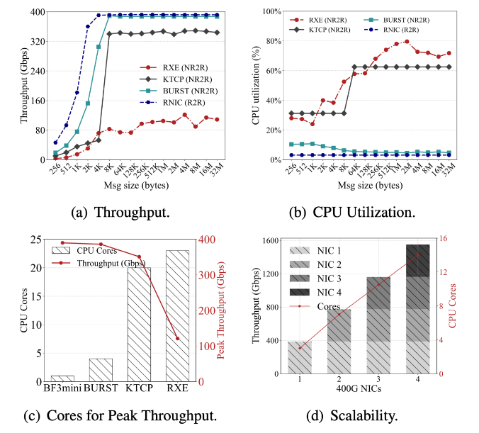 陈果教授团队提出了BURST——一个面向异构环境的高性能Soft-RDMA栈。通过基于用户态的设计、安全可靠的共享资源管理机制,以及结合DPDK与DSA的高效加速,BURST实现了与商用RNIC行为和性能基本一致的RoCEv2通信流程,并在400G环境下首次证明:软件RDMA也可以以较低的CPU开销,实现接近硬件线速的吞吐,并显著提升NR2R场景的连接建立效率与通信性能,为RDMA在异构集群中的大规模落地提供了可行路径。